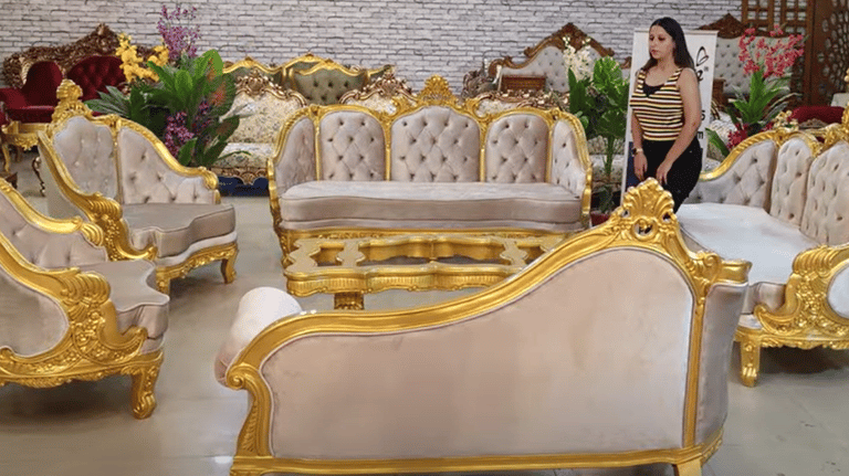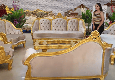 In Pic - 7 feet 3 seaters(2), Diwan 2seater, 2 Single Chairs, Center table - Hand made - Suede Fabric with Quilting - Metallic Gold -